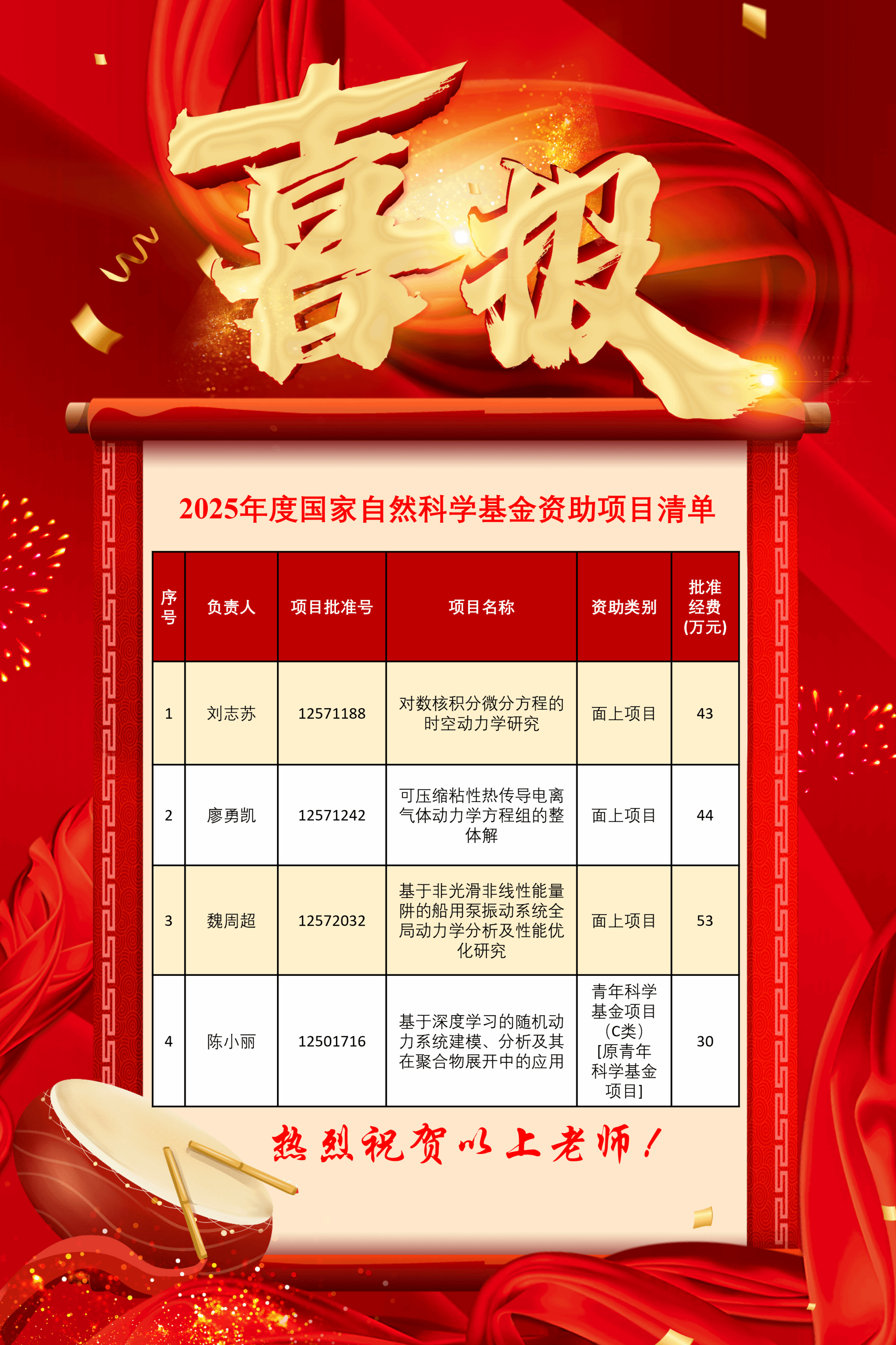 2025年8月27日,国家自然科学基金委员会公布了2025年集中接收期项目评审结果,永利集团官网共有4项项目获得立项资助,其中面上项目3项、青年科学基金项目(C类)[原青年科学基金项目] 1项。