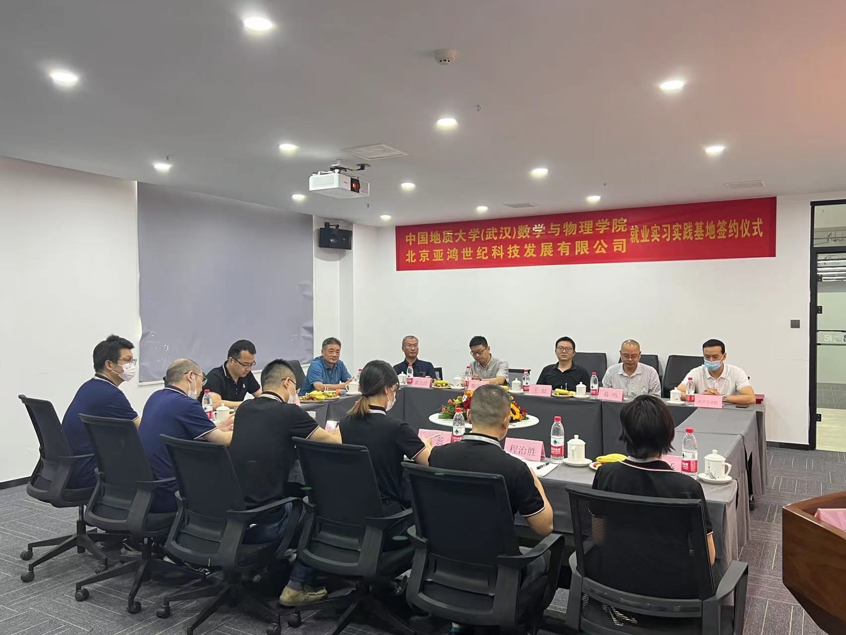 为推进产学研合作,深化本科人才培养模式改革,提高数学类本科人才培养质量,落实访企拓岗促就业专项行动工作要求,加强校企合作,9月30日,永利集团官网与北京亚鸿世纪科技发展有限公司(以下简称“亚鸿公司”)签署中国地质大学(武汉)永利集团yl6809官网就业实践基地协议。学院书记吴太山、学院院长郭上江、副院长魏周超、数学与应用数学系主任王毅、信息与计算科学系主任易鸣、辅导员托乎尼牙孜与北京亚鸿世纪科技发展有限公司总经理兼党支部书记林飞、数据智能分析部总监熊骁、信安产品研发部总监刘俊、产品交付部副总监陈凌浩、启航部副总监刘蕊、数安产品研发部副总监程治胜、研发管理部副经理代春娇以及人力资源部经理李莉等部门负责人座谈交流,共同见证签约。