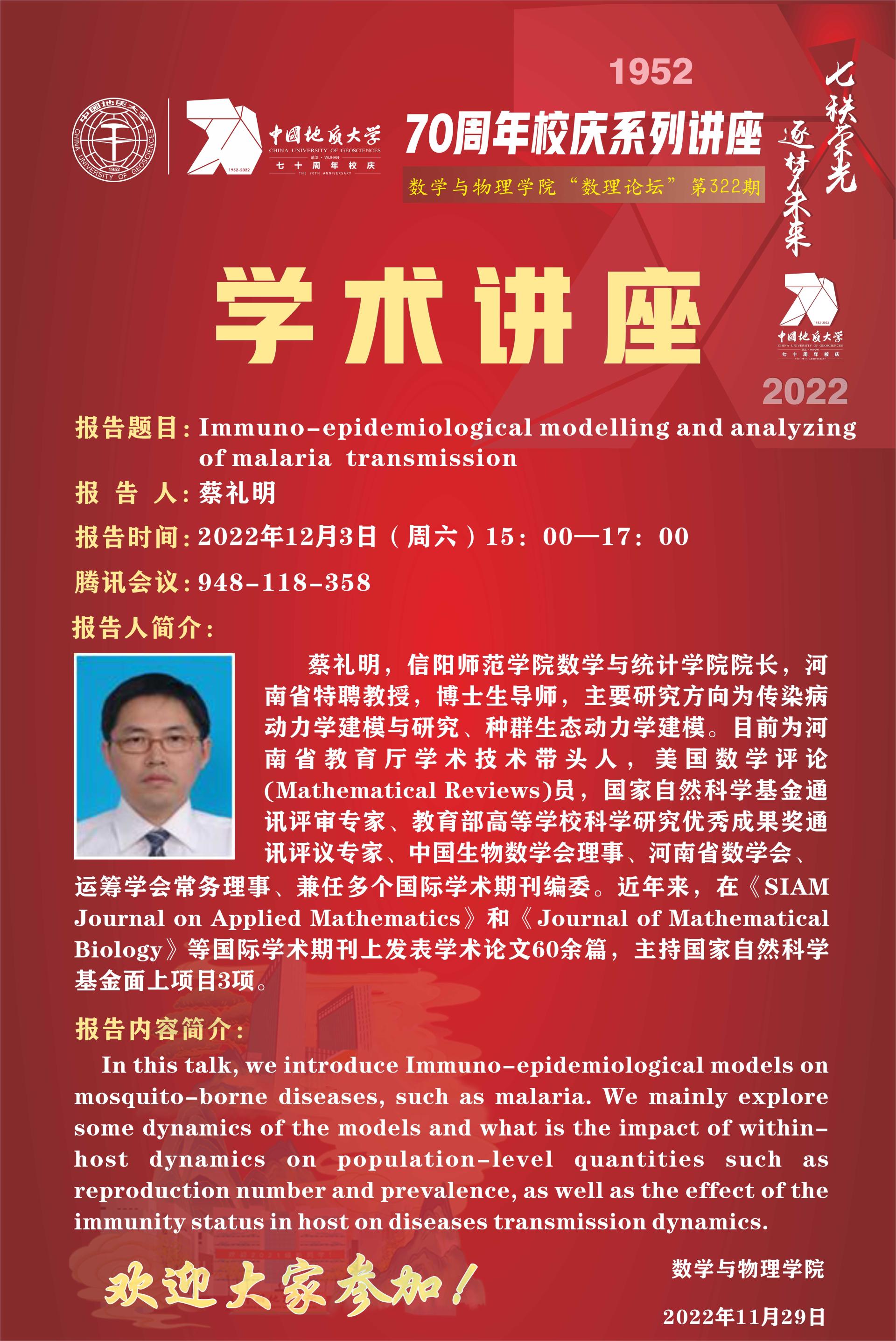 "数理论坛"第322期:Immuno-epidemiological modelling and analyzing of malaria transmission