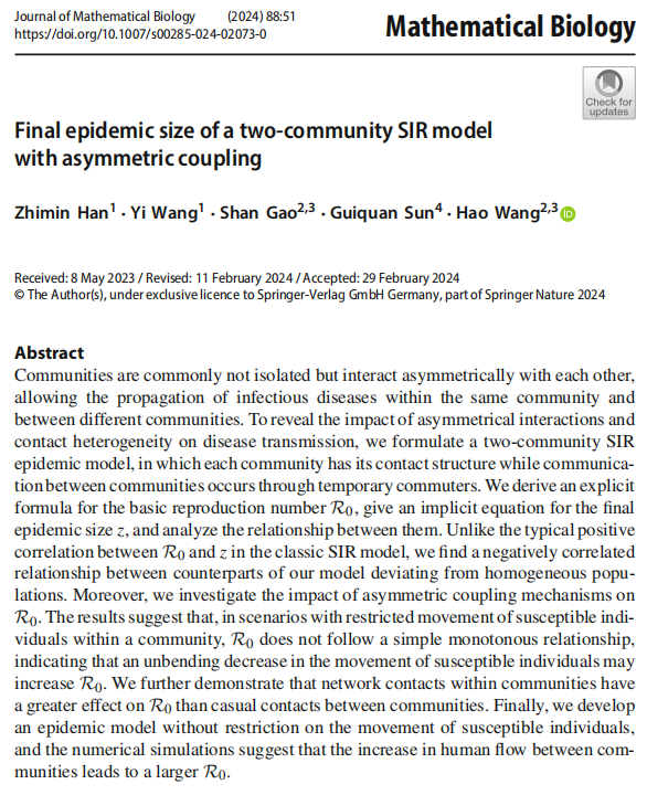 近日,永利集团官网2021级博士生韩志敏以第一作者身份在国际生物数学主流期刊《Journal of Mathematical Biology》上发表题为“Final epidemic size of a two-community SIR model with asymmetric coupling”的学术论文。该论文第二作者为指导教师王毅副教授,通讯作者为加拿大数学生态学和流行病学跨学科实验室主任、阿尔伯塔大学数学与统计科学系王皓教授。