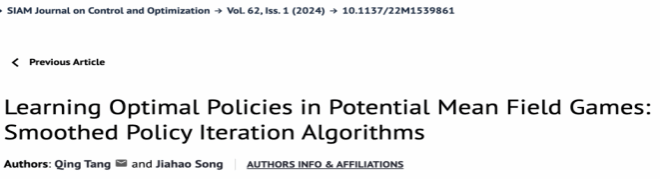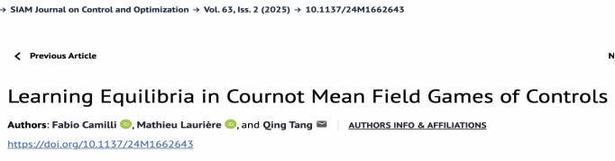 永利集团官网信息与计算科学系教师汤庆博士作为通讯作者的工作 “Learning Equilibria in Cournot Mean Field Games of Controls” 最近发表于SIAM Journal on Control and Optimization。