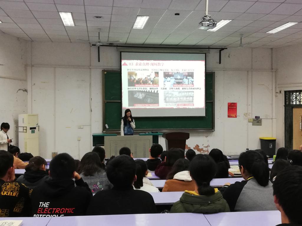 接着,全体参会人员起立唱团歌。然后,走“学习之路”青马班实践分享会代表为同学们讲述他们在井冈山学习的过程与心得体会。期间,代表还随机挑选了两名学生表演井冈山的爱情故事,从而使同学们更好的了解井冈山精神。听完他们的讲述,同学们可以更加详细的了解青马班的活动,从而在后期的活动参与中,能积极上进、脚踏实地、视野开阔,承担历史使命和时代精神。