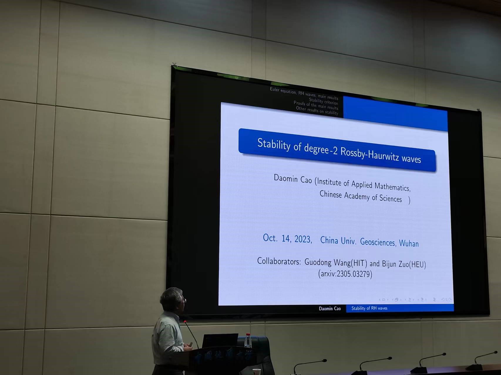 应中国地质大学(武汉)数学科学中心和永利集团yl6809官网邀请,国家杰出青年基金获得者、中国科学院数学与系统科学研究院研究员曹道民于2023年10月14日为中国地质大学名家论坛做了题为“Rossby-Haurwitz波的稳定性”的学术讲座,永利集团官网相关研究领域的老师和学生参加了本次学术讲座。