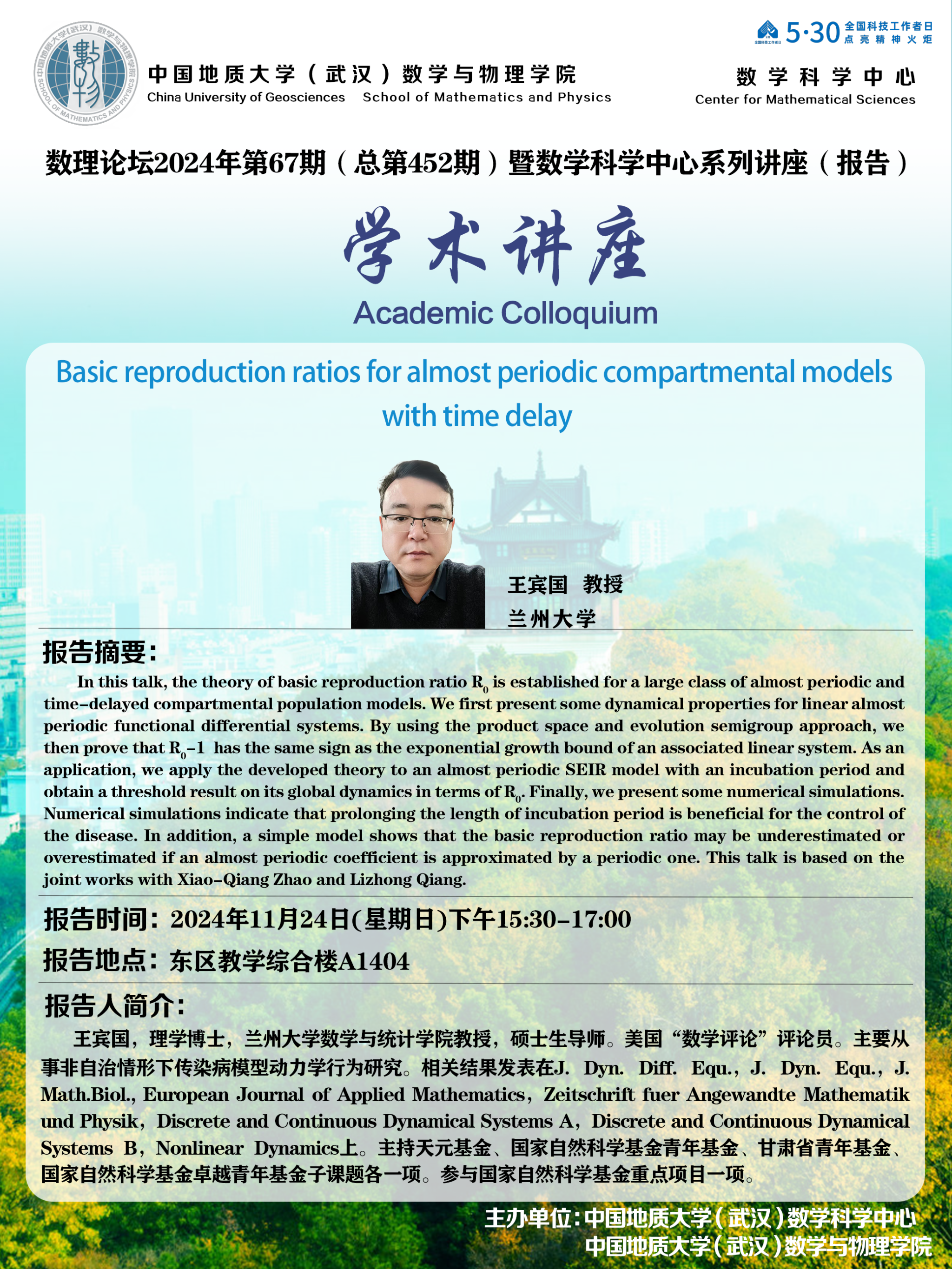 2024年11月24日王宾国教授学术讲座:Basic reproduction ratios for almost periodic compartmental models with time delay